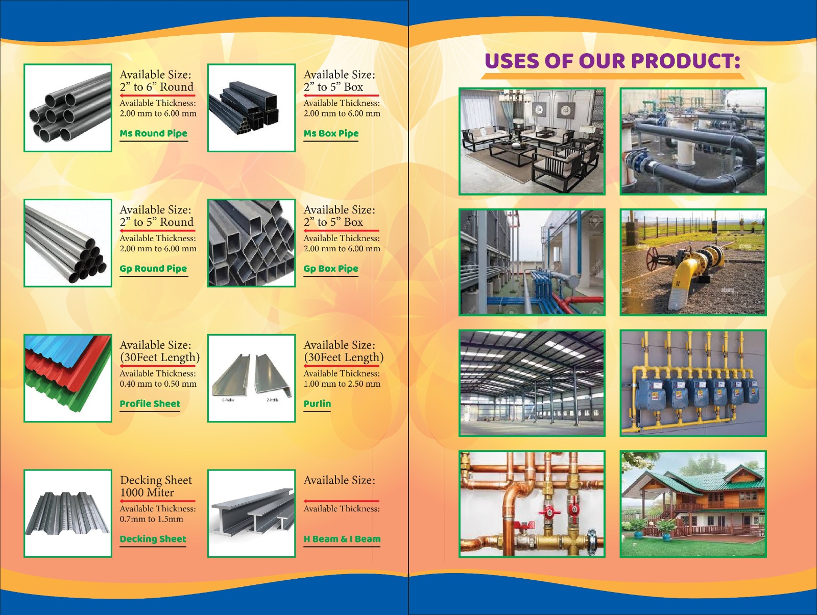 Specialized in Our different product variations Ms Round Pipe Available Size: 2" to 6" RoundAvailable Thickness: 2,00 mm to 5.00 See Details Ms Box Pipe Available Size: 2" to 5" BoxAvailable Thickness: 2.00 mm to 6.00 See Details Gp Round Pipe Available Size: 2" to 6" RoundAvailable Thickness: 2.00 mm to 6.00 See Details Gp Box Pipe Available Size: 2" to 5" BoxAvailable Thickness: 2.00 mm to 6.00 See Details Profile Sheet Available Size: (30Feet Length)Available Thickness: 0.40 mm to 0.50 mm See Details Purlin Available Size: (30Feet Length)Available Thickness: 1.00 mm to 2.50 mm See Details Decking sheet Available Size: 1000 MiterAvailable Thickness: 0.7mm to 1.5mm See Details H Beam & I Beam Available Size: Available Thickness: See Details